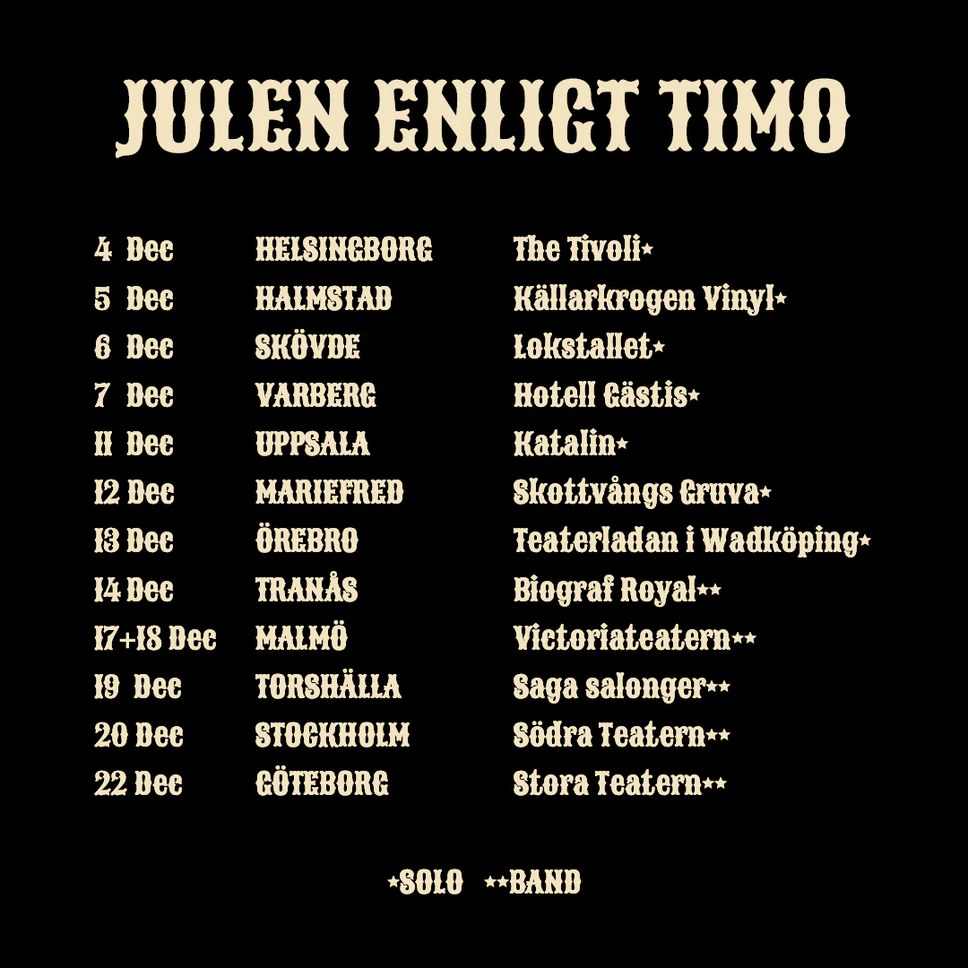 Sedan premiären 2018 har Julen enligt Timo blivit en årlig tradition. I år finns två sätt att uppleva konserten: intimt solo med Timo och en gitarr eller med hela bandet och fullt ställ.